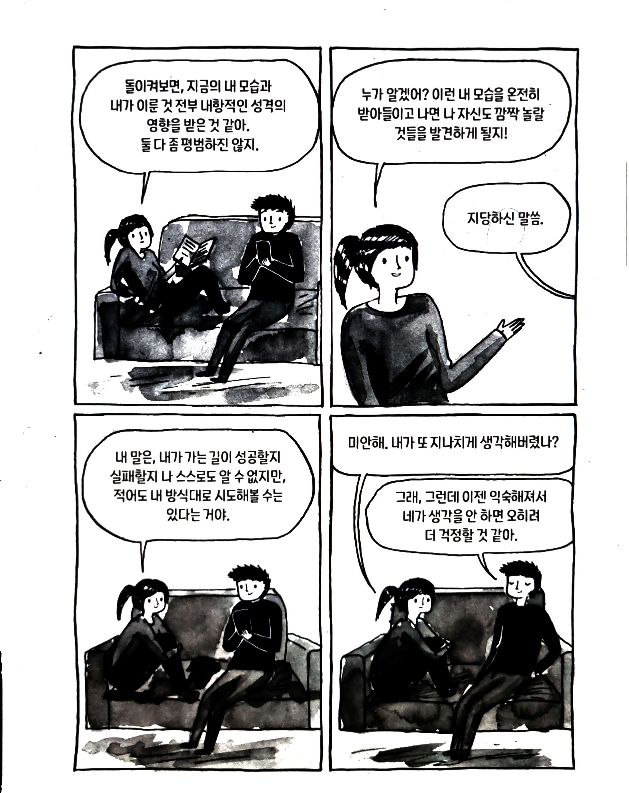 “나 있지 내가 아닌 나를 연기하며 사는 거 이제 정말 지긋지긋해. 왜 내가 사교적이고 말을 더 많이 해야 한다는 강박을 늘 갖고 살아야 하는건데? 내 할 일 알아서 잘하고 있는데도 왜 항상 부족하다고 생각해야 하냐고, 결심했어! 날 이해할 생각조차 없는 사람들 비위를 맞추려고 노력하는 짓은 이제 그만둘거야. ‘너만의 공간에서 좀 나와’ 같은 헛소리에 더 이상 신경쓰지 않을거야. 난 이제부터 달라질거야” - p157.-